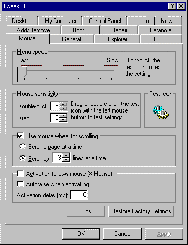 Tweak UI is a free program from Microsoft. It allows you to manipulate the Windows 9x/NT environment: you can tweak the user interface. It is a user friendly face for the Windows Registry Editor.